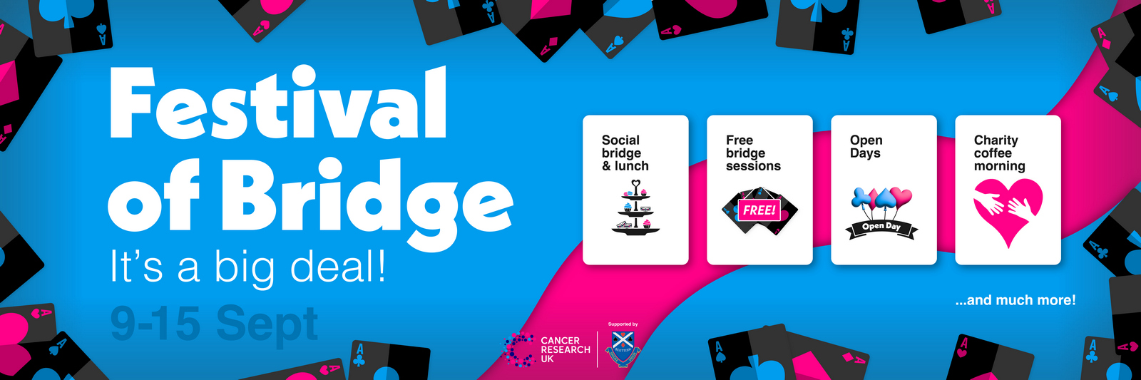 Thanks to all 42 members who came along and supported the Festival of Bridge Fun Friday event on 13th September. We raised a total of £332.97 for Cancer Research UK for the week of Festival of Bridge. Everyone enjoyed themselves, the food was delicious (thanks to Val Morrison, club member and caterer) and the amazing bridge hands provided by Mike Hodder, Steve and Loraine Findlay entertained us all at every level, and hopefully we will never again fall into such devious traps that resulted in going down by 7 tricks despite having 29 points in one hand! The results are available here. The magic card tricks displayed by Cameron amused and baffled us all – he lowered the average age of party goers considerably.